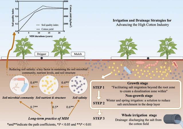 研究发现,膜下滴灌棉田土壤盐分在生育期向根区外侧迁移并于膜间表聚;在非生育期,耕层盐分整体不断向深层运移,棉田土壤盐分储量逐年下降。与此同时,长期膜下滴灌土壤结构得到显著改善,耕层团聚体稳定性不断增强,并促进了土壤微生物群落结构重建与稳定,土壤养分固存能力亦不断增强,因此,优化长期膜下滴灌制度及灌排结合模式能够有效形成土壤低盐区,提升土壤质量和地力,保证棉花持续高产稳产。