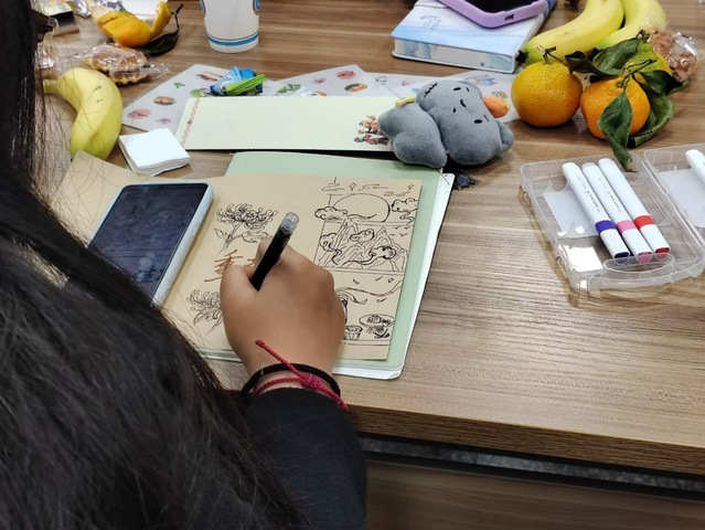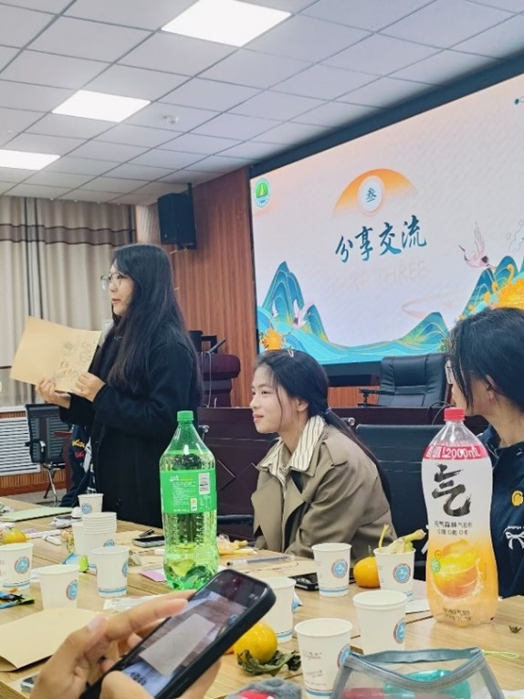 绘制完毕后,主持人邀请同学们积极分享自己的设计构思,其中马琴琴同学构思巧妙:“我在贺卡上画了山峰与飞鸟,老人如山峰,我们如飞鸟,我们可以飞越重峦去往更大的世界,但山峰永远会在那里守着,为我们提供一个归宿,我们应该孝顺老人。”其他同学也积极分享,现场工作人员为发言者与绘制优秀者分发了奖品;最后大家举着自己制作的贺卡合影留念,将此刻的欢乐定格。