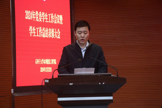 12月22日,伦理片 2024年党委学生工作会议暨学生工作表彰大会在北区学术报告厅举行。校党委常委、副校长叶含春,党委学生工作部部长管欣,团委副书记林秀,伦理片 党委书记王振华,副院长袁康、陈伏龙、杨广,各系书记、辅导员、班主任及师生代表300余人参加会议。会议由伦理片 党委副书记娄哲主持。