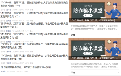 2024年12月,伦理片 官方公众号“蓝泽音”开设了“‘诈’弹来袭,别踩‘坑’里”系列防诈骗小课堂,结合“双12”、春节、开学季等特殊时间节点,通过图文解析、案情分析等形式,长期为同学们推送系列网文,普及反诈知识。截至目前,已累计推文7篇,形成长期“线上”安全课堂。